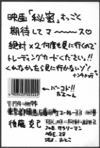 10月15日 残業 「おーいゴトウ、月曜日の打ち合わせやるぞ!」 金曜日の深夜1時からですか? 10月13日 以外 深夜アニメで「セラフィムコール」という番組があります。この番組、毎回一人の少女を主人公に立てて一話完結のオムニバス形式の話を見せていくというものらしいです。そうです、ちょっと前にやっていた「センチメンタルジャーニー」みたいなもんです。あ、知りませんか。簡単に言うとアニメマニアさん達が見るようなアニメです。当然僕も見させてもらいます。 それで、今回の話は中学2年生のロリ少女が主役なんです。彼女は14歳でありながら部屋の中はぬいぐるみだらけ。しかも毎朝ぬいぐるみ達に「おはよう!」「ごきげんいかが?」などと話し掛けるかなりイってる女の子です。 今回の仕掛けとして、この番組を見ている視聴者は実は彼女の持っているぬいぐるみの一つである。 という設定になっているのです。画面は全て「マーガリン」と名付けられたそのぬいぐるみの見ている画面です。固定カメラで部屋を捉えてその中での少女の生活を見守るという感じです。 部屋の中で彼女は視聴者の分身である「マーガリン」に話し掛けてきたり、友達とケンカしてしまったりします。たいした事件が起こるでもなく、淡々と少女の生活を描いて話は進んでいきます。正直面白くも何ともないんですが、なんだか少女の生活を覗き見しているようで何となくドキドキします。 大体メインであるエピソードであるところの「友達とケンカして仲直り」が終わりました。 まあこんなもんかと思っていると、最後の3分でえらいどんでん返しの展開があったのです。 その展開なんですが、いきなり彼女の部屋に警官らしき人間がセンサーのような物を持って入って来ます。その男は 「いやー、パトロールしていたら偶然電波探知機に引っ掛かりましてね。最近多いんですよ。何て言うんですか?ストーカーとかいうやつが。」 などと話しながらセンサーでぬいぐるみを一つ一つ調べて行きます。そして画面にアップでその男の顔が出た時に、センサーから大きな音が。 「これだな。」 男はそう話すとこちらに向かって手を伸ばしてきます。しばらくして両手に何だかの機械を持った男が 「こらっ!覗いてるんじゃないぞ!!覚悟するんだな!」 と叫びつつ機械を壊しました。その途端画面は砂嵐になりました。 そうです。この話はぬいぐるみにカメラを仕込んで女の子の生活を覗き見る変態の視点に立った話だったんです。ドキドキするのも当然です。 ちなみにエンディングのラストシーンは警察に捕まり手錠をはめて連行されていく男の姿でした。 何だこの話 10月12日 汝の正体見たりっ! 9月29日の日記で「好き嫌い」について書きました。その中で『カレーに入っている一見花のつぼみのようで緑色をしていて、噛むと何と言っていいか判らないんですけど強烈な香りが口の中一杯に広がるアレ』と表現しているアレの正体が判りました。 「バナナワニ園」に昨日行ってきたんですがそこのバナナ園の一角にスパイスコーナーというものがあったんです。「カレーに使う香辛料コーナー」みたいな感じでいろいろと紹介されていたんですが、その中にありました。「ビャクダン(白檀)」というものだそうです。 とりあえずモノの名前は判りました。家に帰って辞典で調べてみます。 以下は講談社の「日本語大辞典」からの引用です。 びゃく-だん(白檀)1:熱帯地方に分布するビャクダン科の常緑高木。高さ約10m。葉は長楕円形で対生。花は内側が赤色、外側が黄色。材は香気があり、細工物に利用。香料。sandalwood 2:センダンの異名。 となっていました。え?センダン?センダンっていうと「センダンは双葉より芳し」のあのセンダン?調べてみましょう。 せん-だん(栴檀)1:センダン科の落葉高木。暖地にはえるが、栽培もする。葉は羽状複葉。初夏に、淡紫色の五弁花を多数つける。果実は楕円形で黄熟。樹皮は虫くだし、果実は鎮痛・整腸に用いられる。オウチ。 2:ビャクダンの異名。 よく判らないんですが何だか全然別物のようでもあり同じようでもあり、益々判らなくなってしまいました。ちなみに「オウチ」とはセンダンの古名だそうです。このままではデートの時に「嫌いな物何かあるの?」と聞かれて「うん、ちょっとビャクダンが食べれないんだ。」と答えるべきなのか「あー、センダンだけは好きになれないんだよ。」と答えるべきなのか判りません。 そこで会社にある小学館の日本大百科全書で調べてみました。 センダン〔栴檀〕学:Melia azedarach L. センダン科の落葉高木。高さ約六〜八m、幹は太く、枝が広く四方に分かれ、枝先近くに奇数羽状複葉をやや密に互生する。小葉はさらに五〜七枚の奇数羽状複葉となり、最終小葉は鈍い鋸歯があり、卵状楕円形で先は鋭くとがり、基部は鈍くとがる。五〜六月、枝先に大形の複集散花序をつけ、小型の淡紫色花を密生する。まれに白色花のものもある。花弁、蕚片ともに